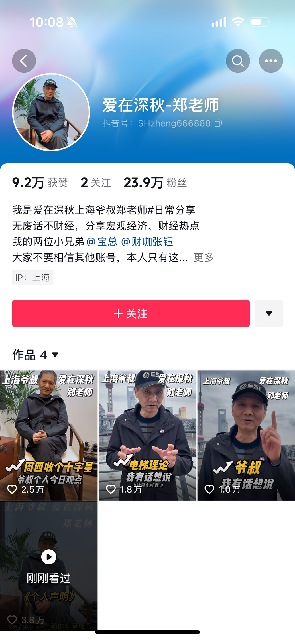 澎湃新闻记者注意到,目前,在抖音平台亦有同名账号“爱在深秋-郑老师”,该账号于11月18日发布类似“个人实名账号声明”,截至21日时,该抖音账号已有约23.9万关注者,并已发布4条视频。