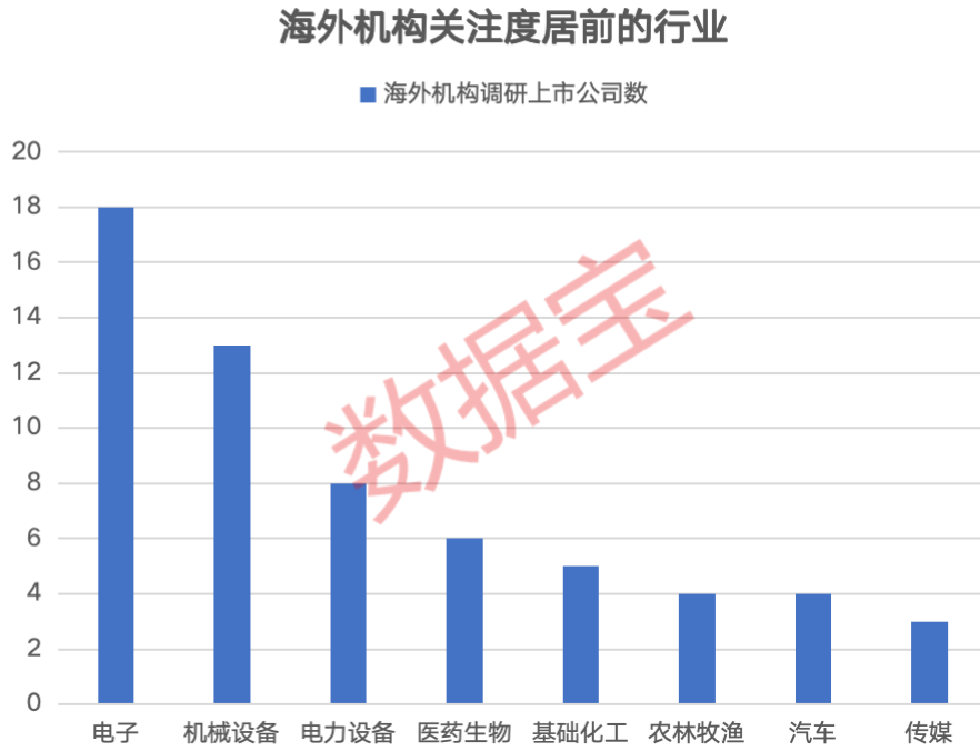分行业来看,电子、机械设备最受海外机构关注,调研的上市公司数目分别有18家、13家。细分领域来看,海外机构目前最关注半导体行业的发展状况,18家电子行业上市公司中11家属于半导体领域,包括东微半导、澜起科技、纳芯微等调研机构数超10家。