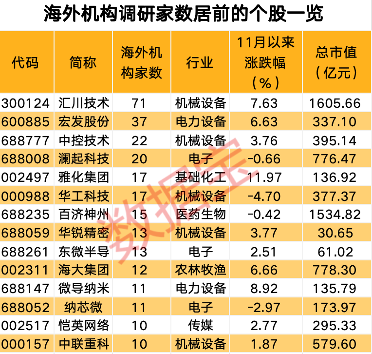 据证券时报·数据宝统计,近10日(11月7日至11月20日),海外机构对78家上市公司进行调研,海外机构调研榜单中,汇川技术参与调研的海外机构达到71家,最受关注;其次是宏发股份,参与调研的海外机构共有37家。