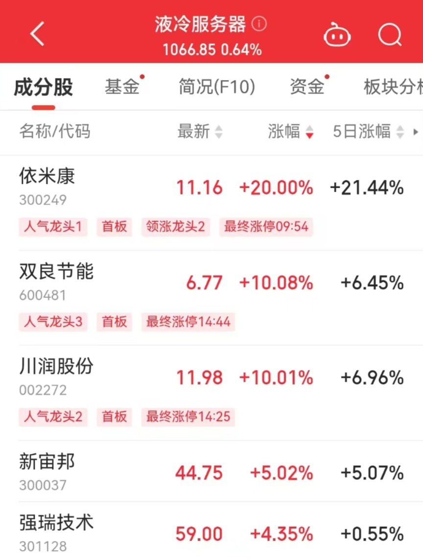 11月21日,A股市场液冷服务器板块异动,依米康、双良节能、川润股份涨停,统一股份、立讯精密、中科曙光等跟涨。依米康的关键设备精密温控设备、微模块数据中心等产品和技术广泛应用于多个行业。百度、阿里巴巴、华为、腾讯等都是公司的重要客户和战略合作伙伴。