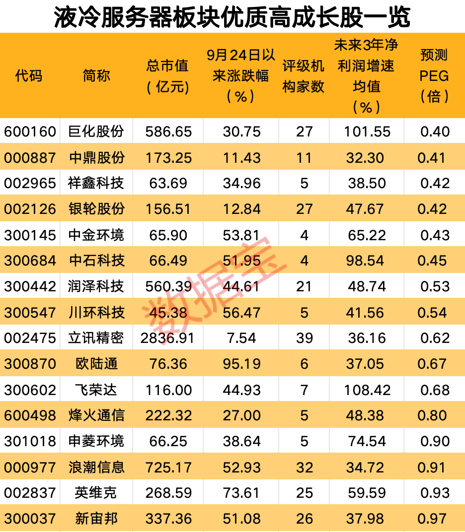 此外,巨化股份、中鼎股份、祥鑫科技、银轮股份等个股预测PEG均低于0.5倍。巨化股份曾表示,公司适应液冷市场发展需求,继续加大氟化液冷媒产品研发。