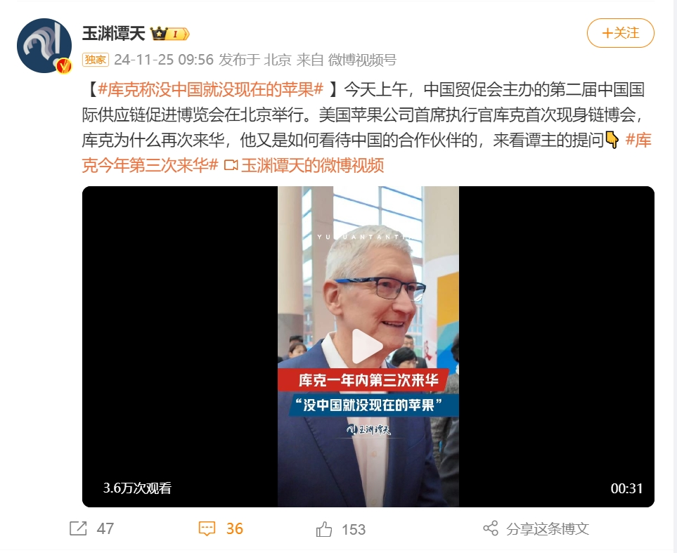 10月21日,库克发微博称“很高兴再次回到北京”。