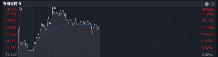 早盘,来凯医药-B(02105.HK)最高上涨超22%,创年内新高。截至发稿,涨幅收窄至14.55%,报15.88港元/股。