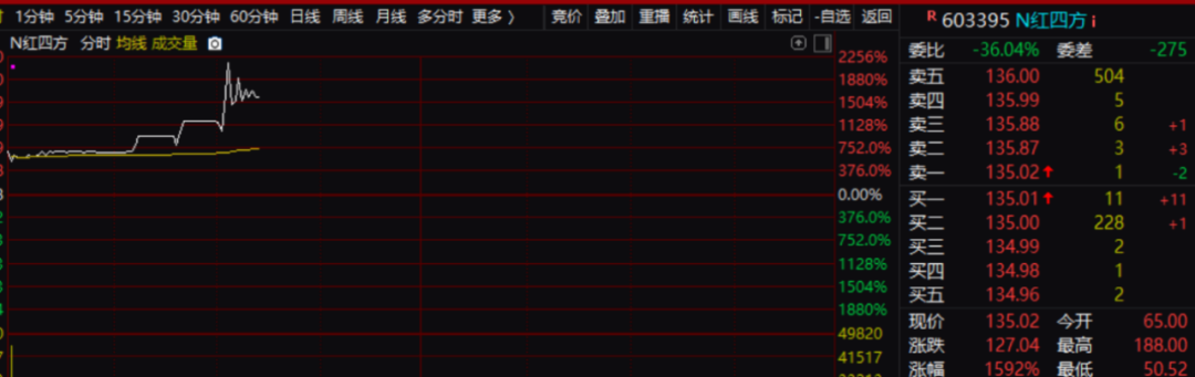 今天早盘,新股N红四方复牌后持续走高,成交金额超18亿元,股价最高达188元,盘中最大涨幅一度达2256%,按其发行价7.98元/股计算,中一签可赚超9万元。在近期打新收益有所收敛的背景之下,该股的表现可以说非常亮眼。