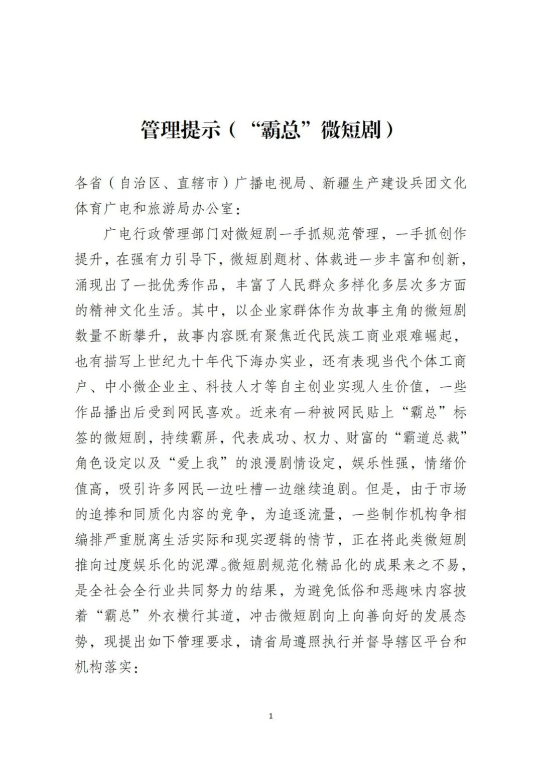 近日,广电总局网络视听司连续发布两个管理提示,对于当前在中老年题材和所谓“霸总”题材微短剧创作中出现的不良倾向,进行及时提示和规范,推动微短剧创作持续向上、向善、向美。
