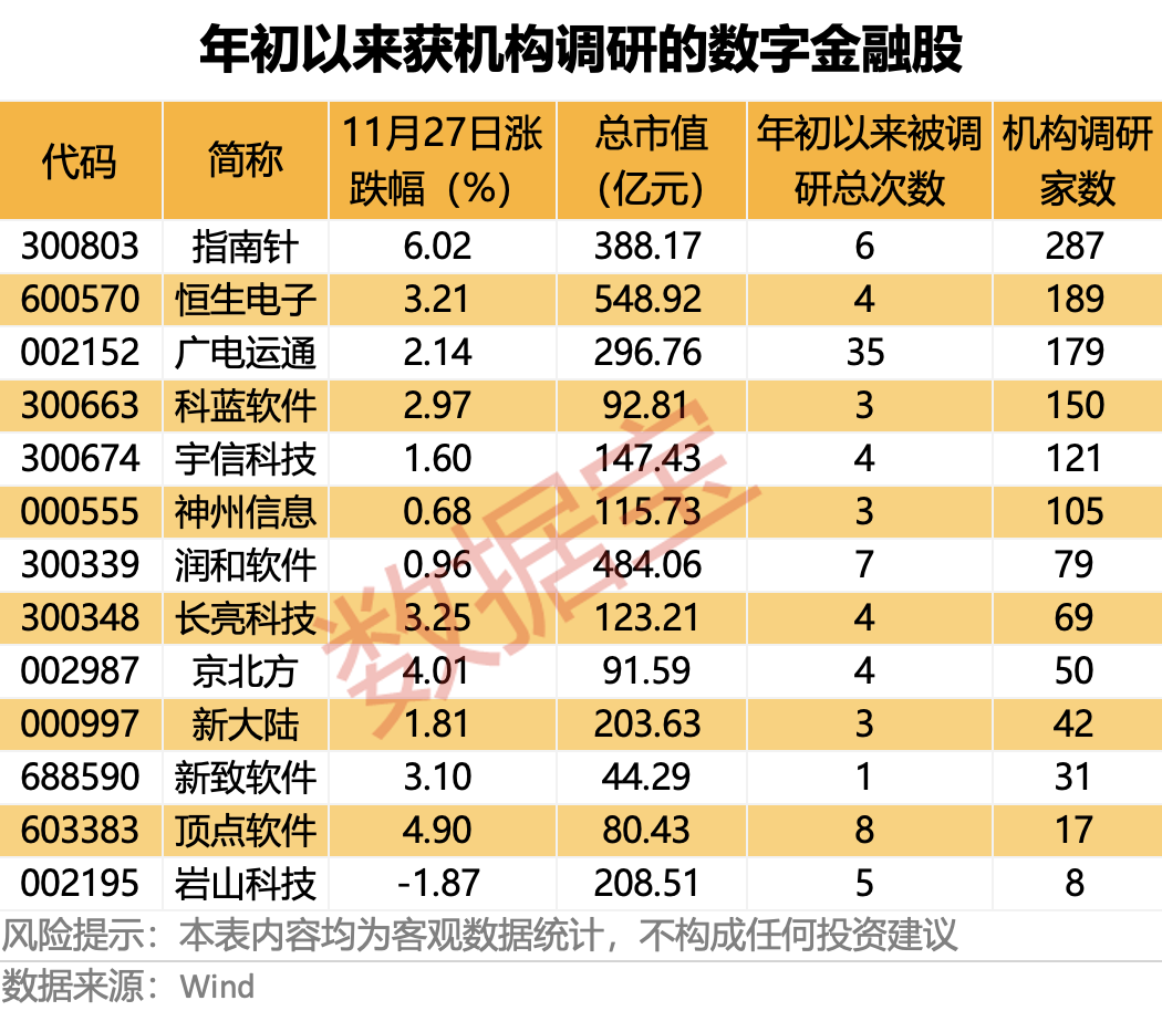 部分数字金融概念股备受机构关注。据数据宝统计,13只数字金融股年初以来获得机构调研,以机构调研家数来看,指南针累计获得287家机构调研居首;恒生电子、广电运通、科蓝软件等均获得150家以上机构调研。
