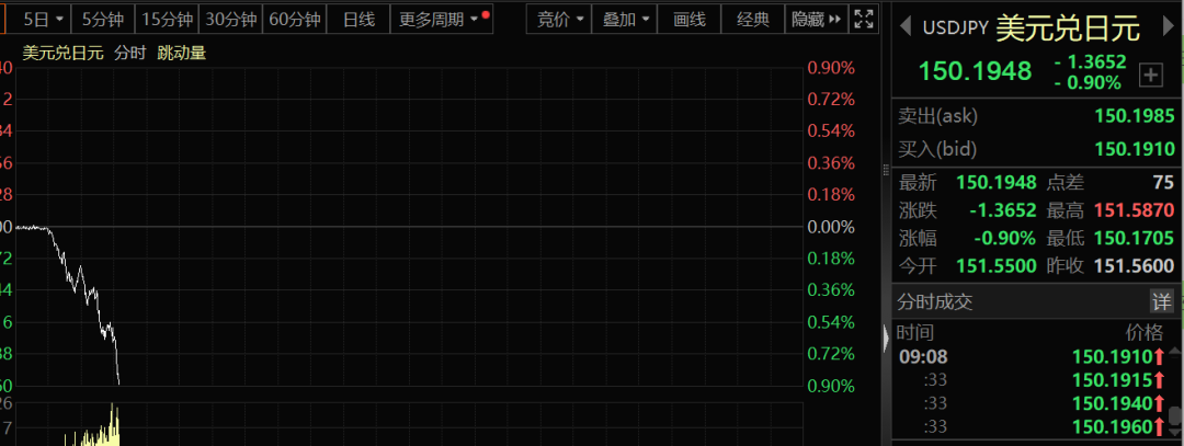 今天早上,亚太市场开盘,美元兑日元直接跳水,跌幅一度扩大至8000点以上。最近,美元兑日元持续走强,并从156上方跌至150.1附近。