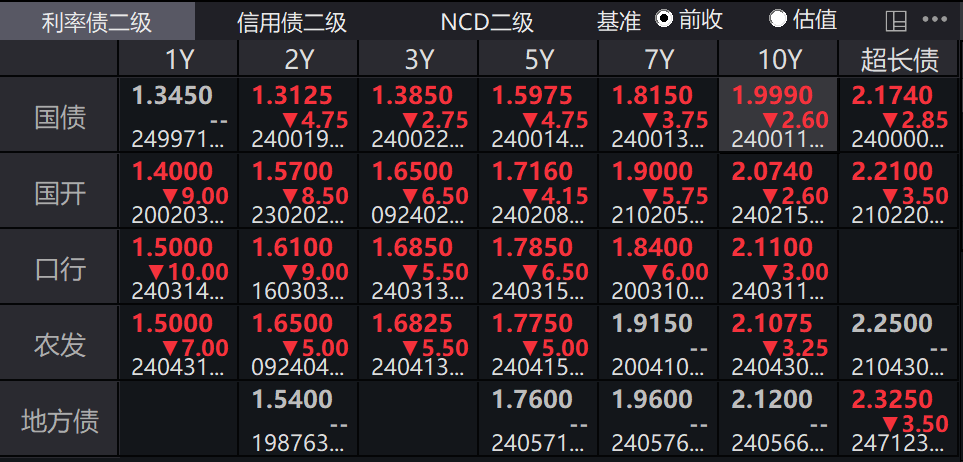 截至上午发稿时,10年期国债活跃券240011收益率已下破2.0000%,创历史新低;最低一度行至1.9980%,随即在1.9990%位置窄幅波动。