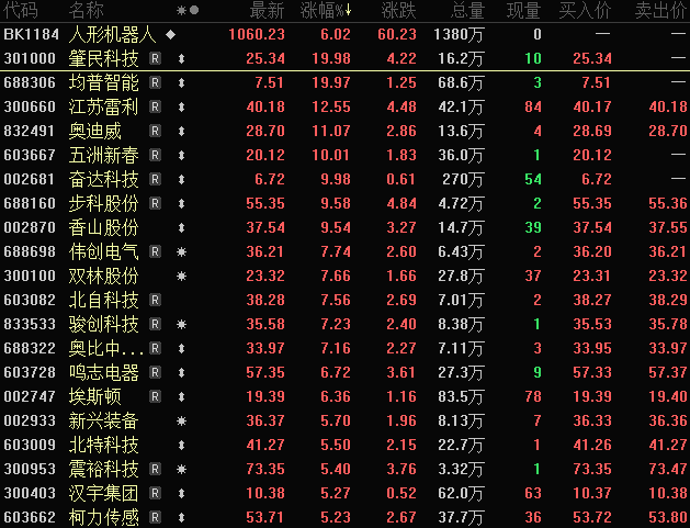 人形机器人指数早盘上涨超6%,位居概念板块涨幅榜前位,肇民科技、均普智能20%涨停,五洲新春、奋达科技等涨停。