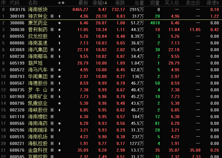 海南板块掀起涨停潮,海南发展、海南高速、海南椰岛、海汽集团、海南华铁、海南橡胶、海南机场近20股涨停。