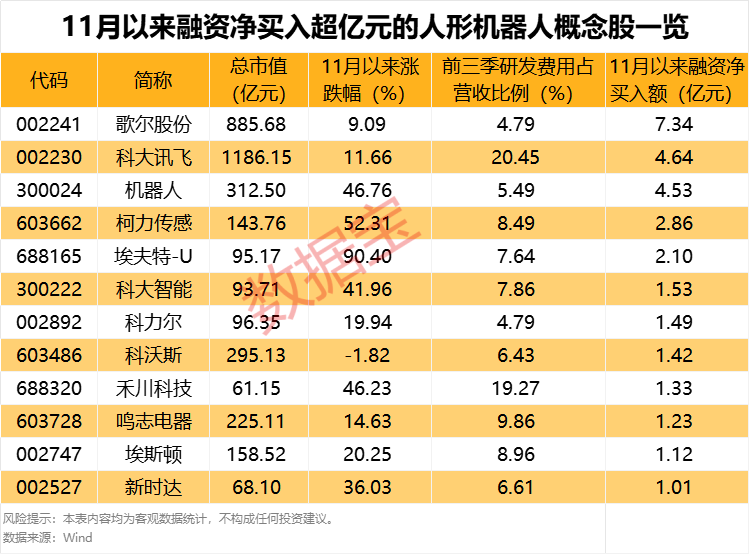 从资金面来看,11月以来,超六成概念股获得融资客加仓,其中12只股的融资净买入额超亿元,歌尔股份、科大讯飞、机器人、柯力传感、埃夫特-U的融资净买入额居前,均超2亿元。