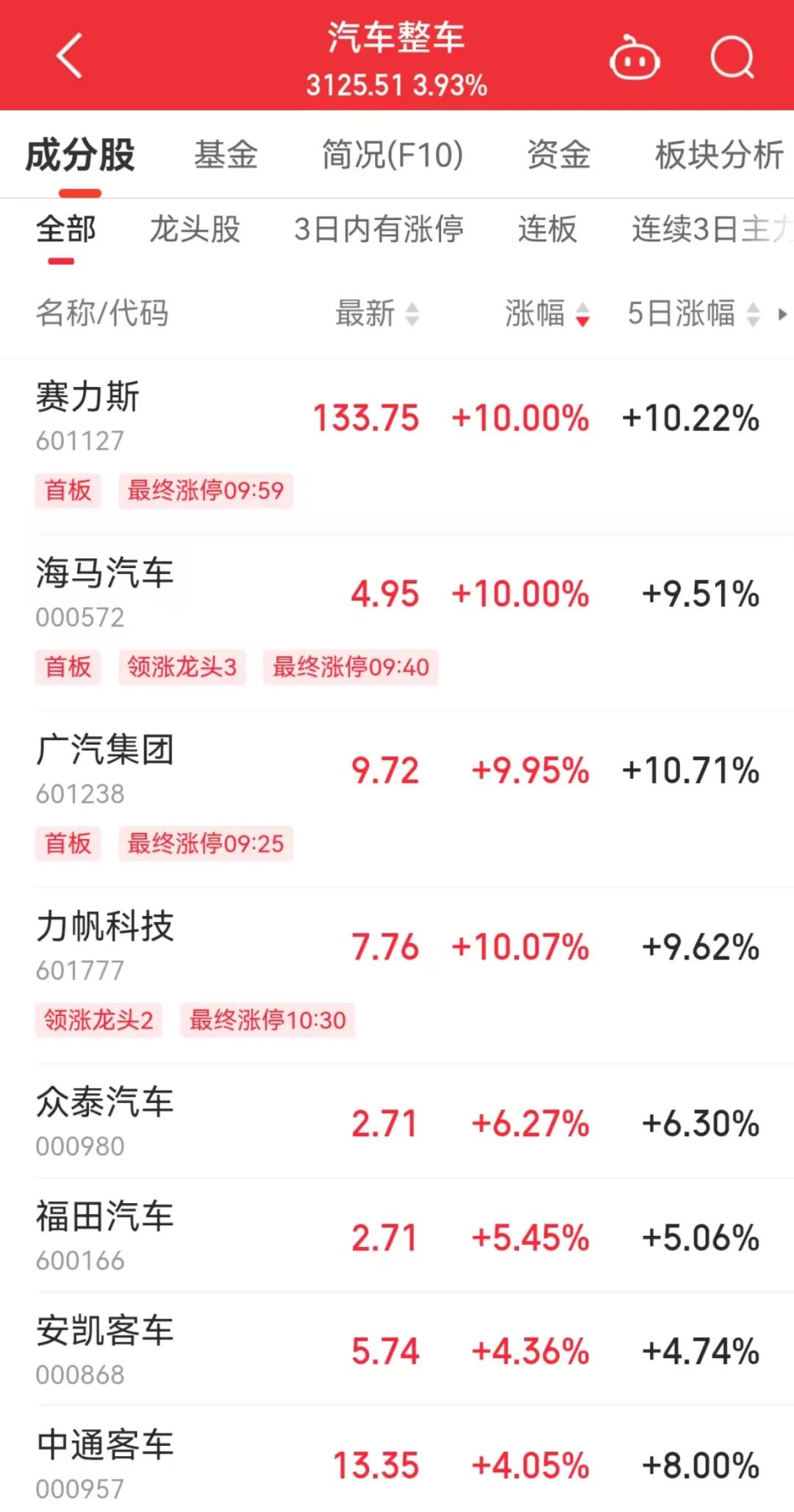 今天,汽车板块走强,广汽集团、赛力斯、海马汽车涨停,力帆科技、众泰汽车等涨幅靠前。