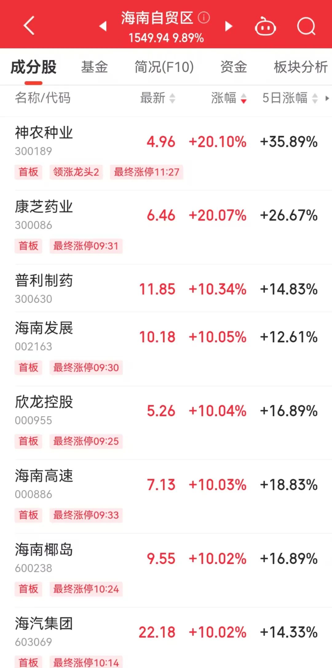 今天上午,海南自贸区板块爆发,康芝药业、海南发展、欣龙控股、葫芦娃等20多只个股涨停,板块内个股无一下跌。