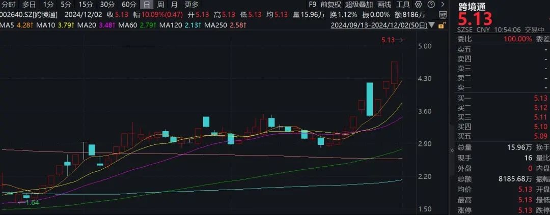 12月2日,跨境通(002640)开盘即封死涨停,报5.13元/股,总市值近80亿元。