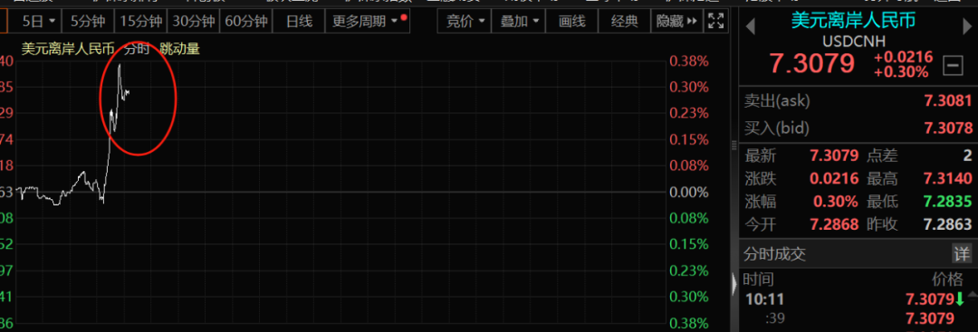 随着美元的大涨,原本因为加息预期而大涨的日元也开始走弱。人民币也是跟随走低。今天早盘,离岸人民币兑美元跌破7.31,最低触及7.3148元,创去年11月来新低,日内跌约280点。