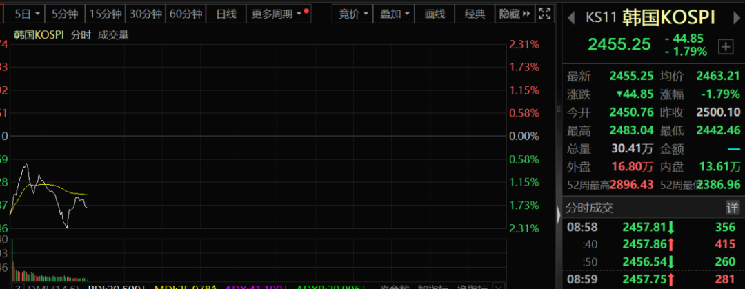 与此同时,韩国市场也迎来了巨震。早盘,韩国KOSPI一度跌超2%,韩元昨夜和今早也是持续跳水,亚太市场也迎来压力,日经指数冲高后转跌,澳大利亚股指亦走低。市场对于韩国政局的担心仍在延续。