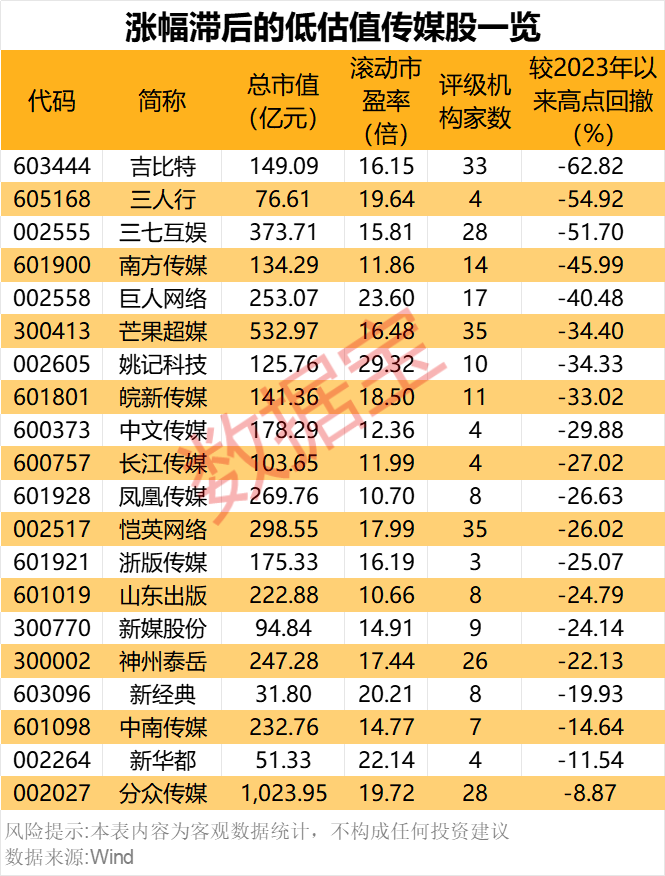 自9月24日以来,申万传媒板块大涨47.53%,个股快速反弹,流金科技、易点天下、天龙集团、福石控股、蓝色光标等10只个股股价翻倍。不过仍有部分个股还趴在地板上,部分获机构看好的低估值股或迎来补涨。