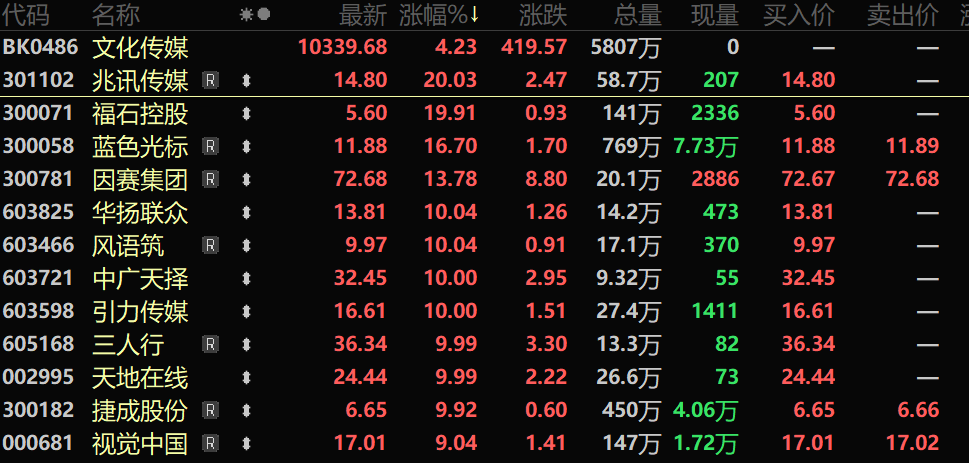 消息一出,引领市场情绪修复,连续下跌的传媒股大幅反弹领涨两市,兆讯传媒、福石控股均“20cm”涨停,蓝色光标、因赛集团涨超10%,华扬联众、风语筑、中广天择、引力传媒、三人行、天地在线涨停。