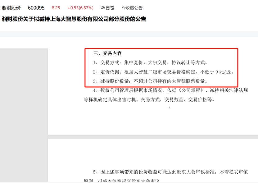 对于减持大智慧股份的数量,湘财股份仅表示,不超过该公司持有的大智慧股票数量,即减持数量可以小于或等于所持有的数量。