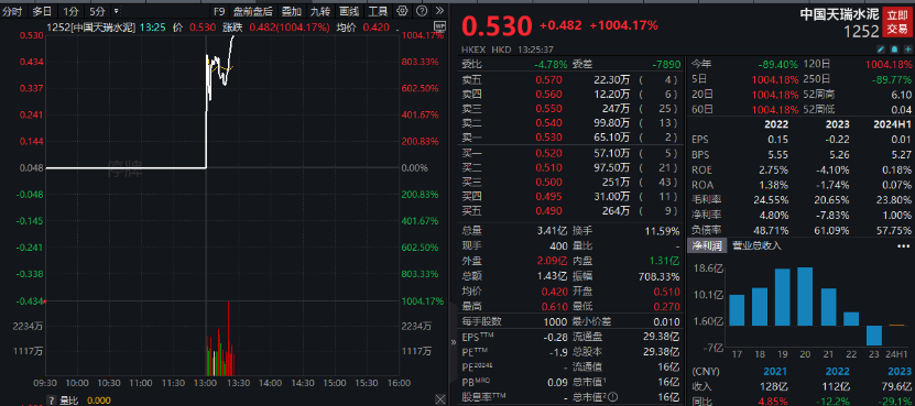 午后复牌的中国天瑞水泥,股价也出现暴涨行情,该股盘中一度大涨1170%,最高触及0.61港元。截至券商中国记者发稿时,中国天瑞水泥股价涨幅超过1000%,报0.53港元/股。