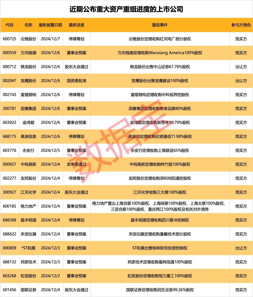 据证券时报·数据宝统计,在过去的一周(12.2—12.6)中,共计19家上市公司披露重大重组最新进展。