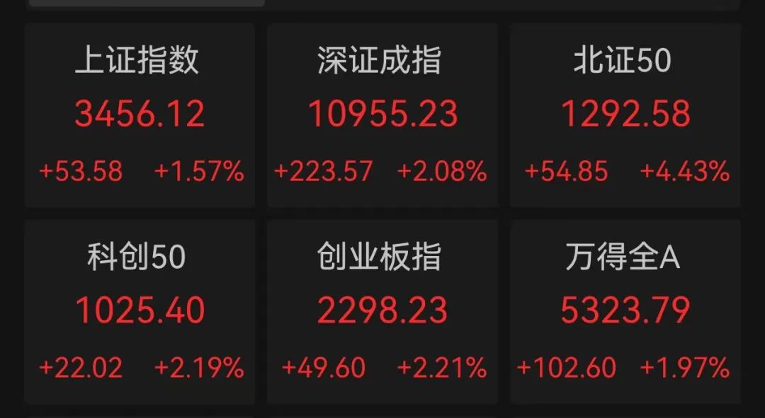 12月10日早盘,A股市场大面积上涨,开盘超5200股飘红。上证指数开盘上涨2.58%,直逼3500点。深证成指、创业板指、科创50指数分别上涨3.66%、4.88%、4.8%。