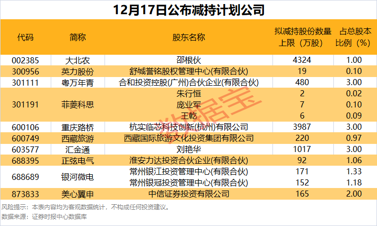 12月17日共有10家公司公布股东减持计划。以拟减持数量上限占总股本比例统计,汇金通、粤万年青、重庆路桥等股东拟减持比例居前。