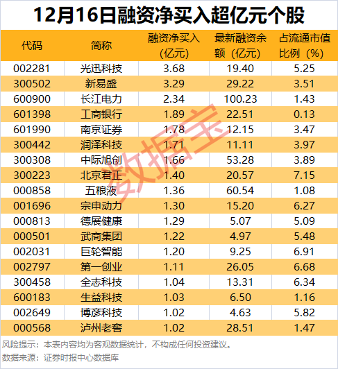 具体到个股,12月16日获融资净买入千万元以上的有440只,其中18只融资净买入额超亿元。光迅科技融资净买入额居首,当日净买入3.68亿元,其次是新易盛、长江电力,融资净买入金额分别为3.29亿元、2.34亿元,融资净买入金额居前的还有工商银行、南京证券、润泽科技等。