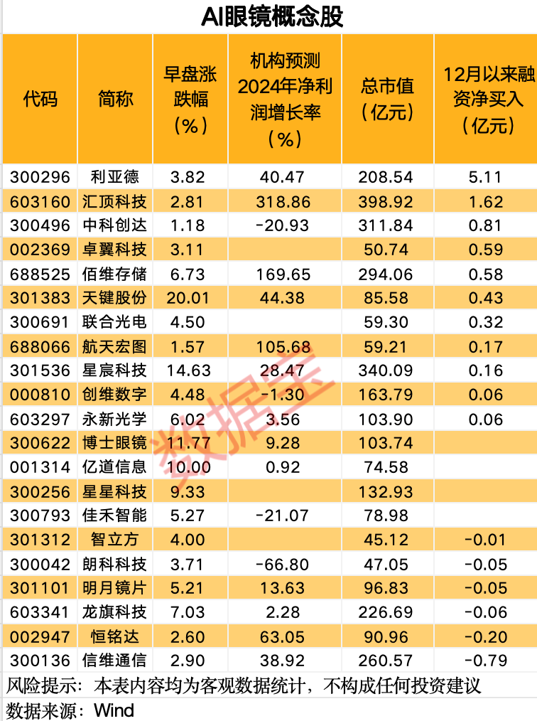 据证券时报·数据宝统计,A股中布局AI眼镜的概念股共有21只。从机构关注度来看,中科创达、明月镜片、永新光学等10股获得5家及以上机构评级,占比接近总数的五成。根据机构一致预测,13股今年有望实现盈利同比增长,其中3股2024年净利润增长率有望超过100%,包括汇顶科技、佰维存储、航天宏图。