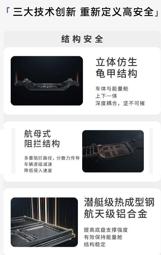 宁德时代(上海)智能科技董事总经理杨汉兵介绍,宁德时代磐石底盘从底层逻辑深入探索结构与材料创新路径,以三方面技术新突破,实现全场景、全速域超强守护,为整车带来坚如磐石的安全。磐石底盘首创立体式仿生龟甲结构,车体结构与能量舱结构上下一体,深度耦合,叠加航母式阻拦结构,一旦受到猛烈撞击,可最大程度减缓底盘侵入、减少能量舱变形。