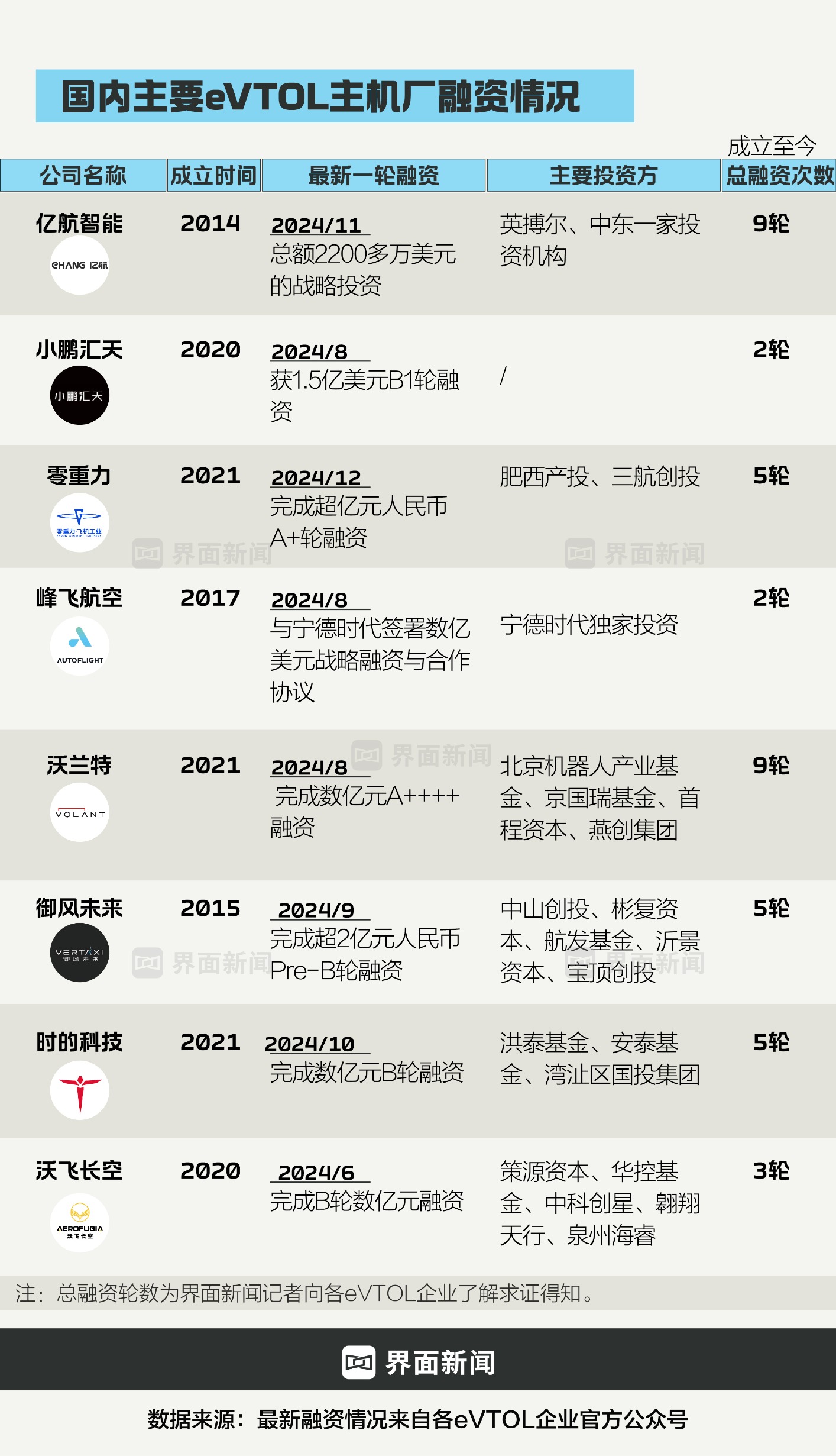沃兰特总融资轮数迎头赶上,近期刚完成第9轮融资,但是尚未对外公开发布,今年内的融资次数达到6轮。其核心产品VE25-100是典型的复合翼构型,也是目前全球范围内已知的起飞量最大、且客舱空间最宽阔的载人eVTOL。其余主机厂总融资轮数少则2-3轮,多则5轮。