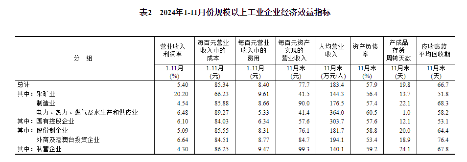 11月末,规模以上工业企业每百元资产实现的营业收入为77.7元,同比减少2.9元;人均营业收入为183.4万元,同比增加6.4万元;产成品存货周转天数为19.8天,同比增加0.1天;应收账款平均回收期为66.7天,同比增加4.2天。
