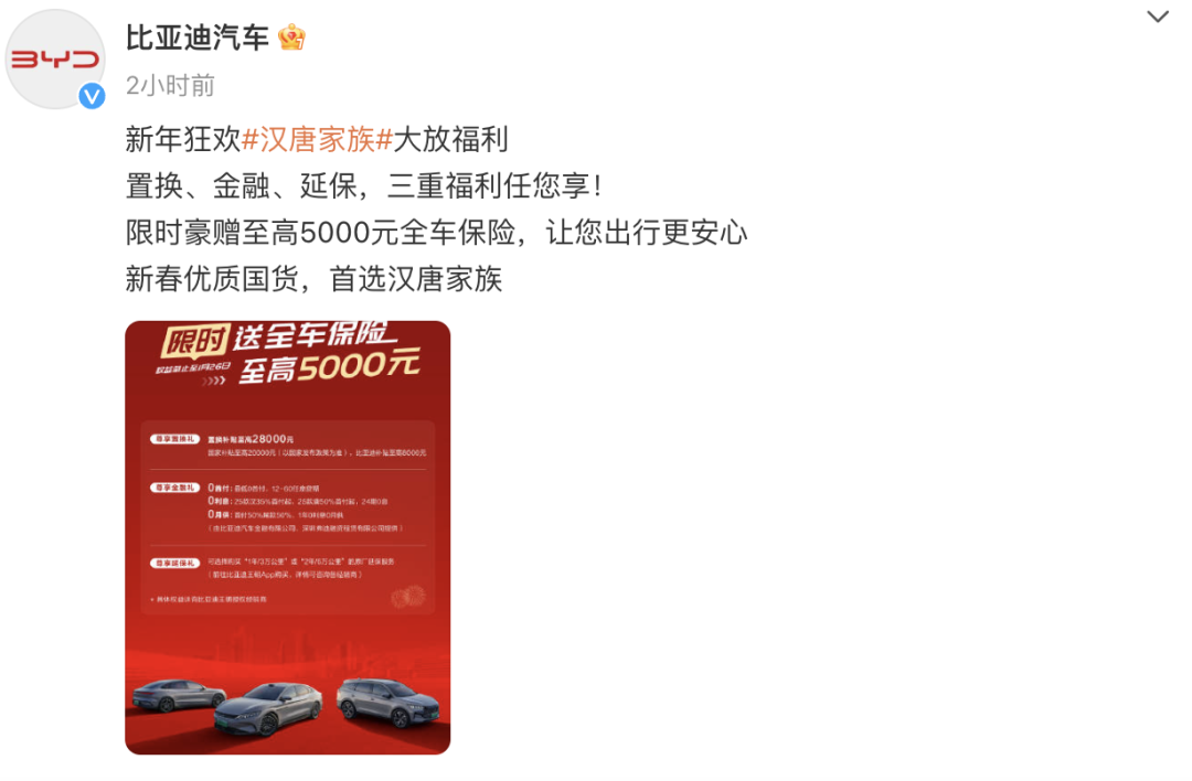 12月27日,“比亚迪汽车”官方微博发文称,即日起至2025年1月26日,对秦PLUS EV荣耀版限时优惠1万元,对第二代宋Pro DM-i也进行限时优惠活动,优惠后两款车型起售价均为9.98万元。并且,上述两款车型置换补贴最高分别为2.5万元和2.4万元。此外,比亚迪还针对汉唐家族推出了限时送至高5000元的全车保险活动。