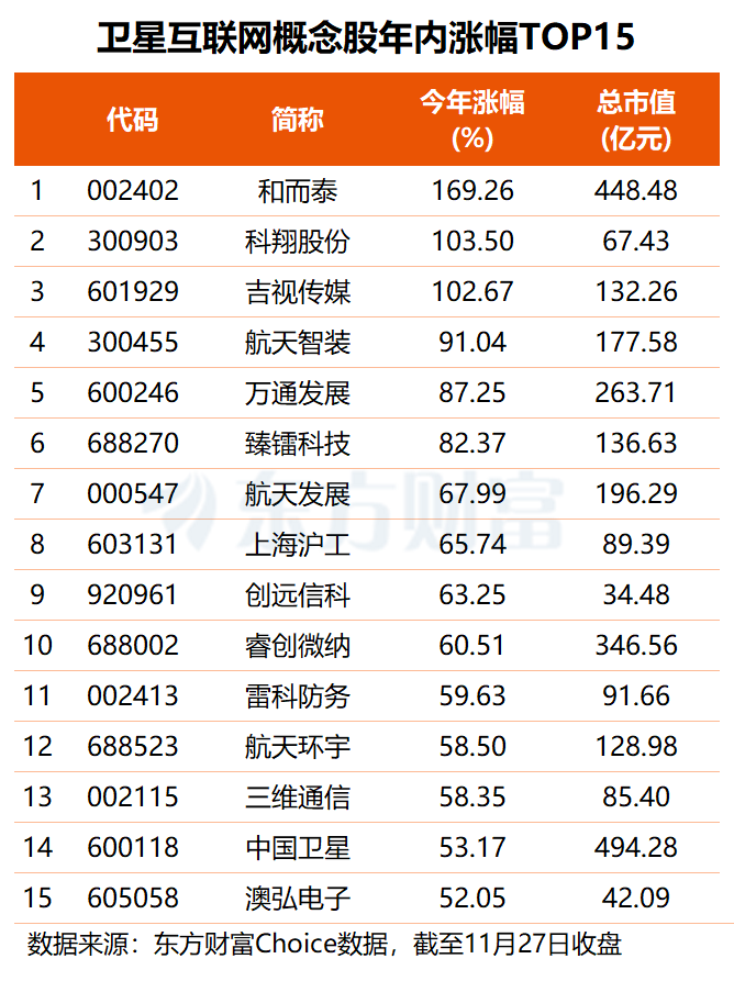 近九成卫星互联网概念股年内股价实现上涨,平均涨幅约30.09%。其中,和而泰、科翔股份、吉视传媒等3股涨幅均超一倍,航天智装、臻镭科技、航天发展、上海沪工、雷XM交易官网科防务等12股区间涨幅均在50%-100%之间。