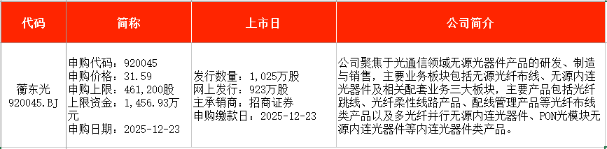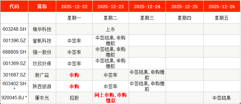 从时间表看,新广益(301687)、陕西旅游(603402)将在本周一(12月22日)申购;蘅东光(920045)将在本周二(12月23日)申购。