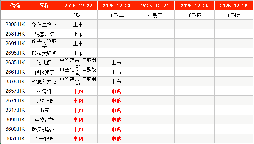 港股方面,Wind数据显示,本周(12月22日至12月26日)林清轩(02657.HK)、美联股份(02671.HK)XM交易官网、迅策(03317.HK)、英矽智能(03696.HK)、卧安机器人(06600.HK)、五一视界(06651.HK)将在周一至周二申购。