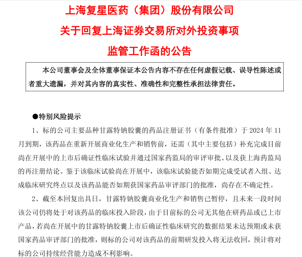 时隔一周,复星医药正式回复上交所就公司对外投资绿谷医药事项的监管工作函。