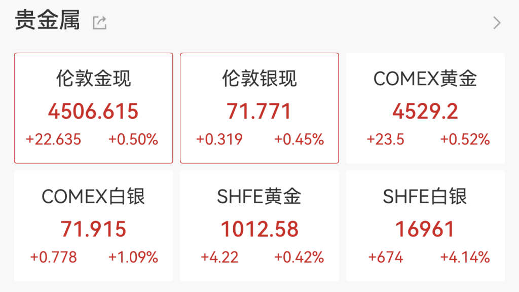 12月23日,现货黄金盘中再创历史新高,逼近4500美元/盎司。现货白银首次突破70美元/盎司。国际贵XM交易官网金属期货普遍上涨,COMEX黄金期货收涨1.02%,报4515美元/盎司,创历史新高;COMEX白银期货收涨4.44%,报71.61美元/盎司,创历史新高。