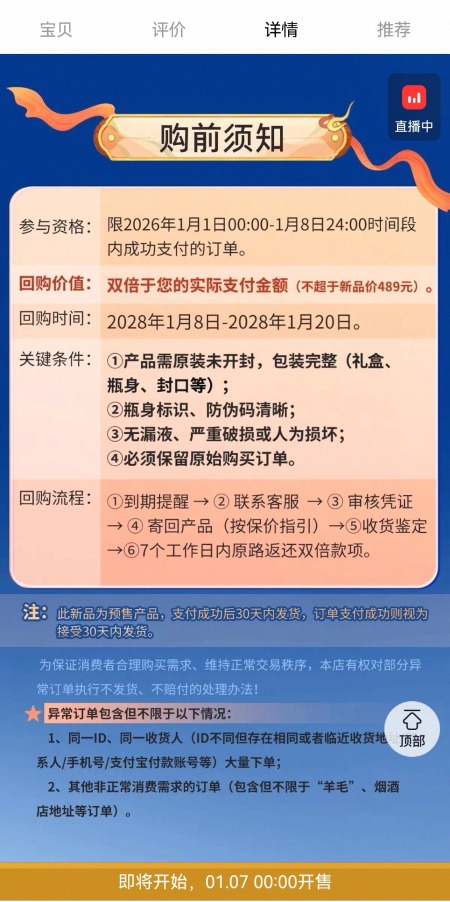 此外,产品页面也提示了需满足的XM交易官网关键条件包含四方面:1、产品需原装未开封,包装完整(礼盒、瓶身、封口等);2、瓶身标识、防伪码清晰;3、无漏液、严重破损或人为损坏;4、必须保留原始购买订单。页面还提示,此新品为预售产品,支付成功后3XM交易官网0天内发货。