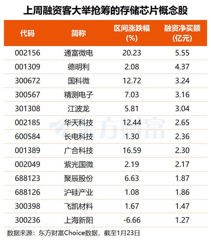 资金方面,东方财富Choice数据显示,上周共有46只存储芯片概念股获得融资净买入,其中13股融资净买额超1亿元,通富微电、德明利分别XM交易官网获融资客抢筹5.55亿和4.37亿元,国科微、精测电子、江波龙均获杠杆资金加仓超3亿元,华天科技、紫光国微等4股也获融资净买入2亿元以上。